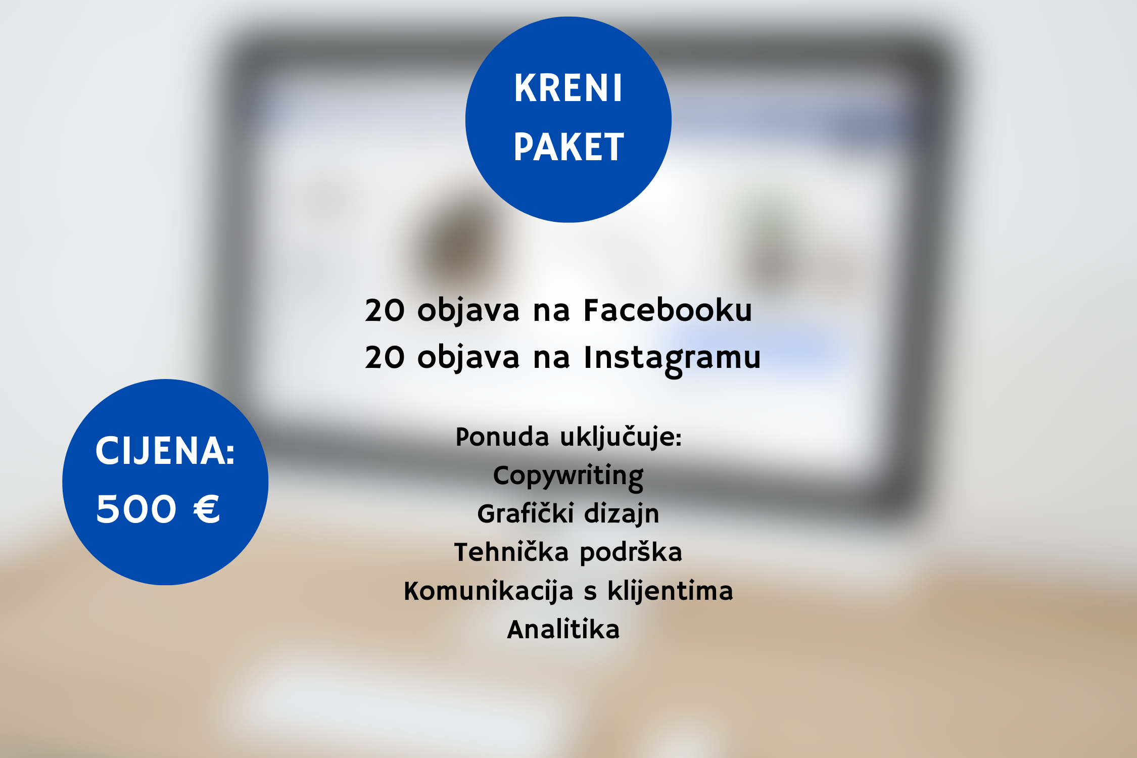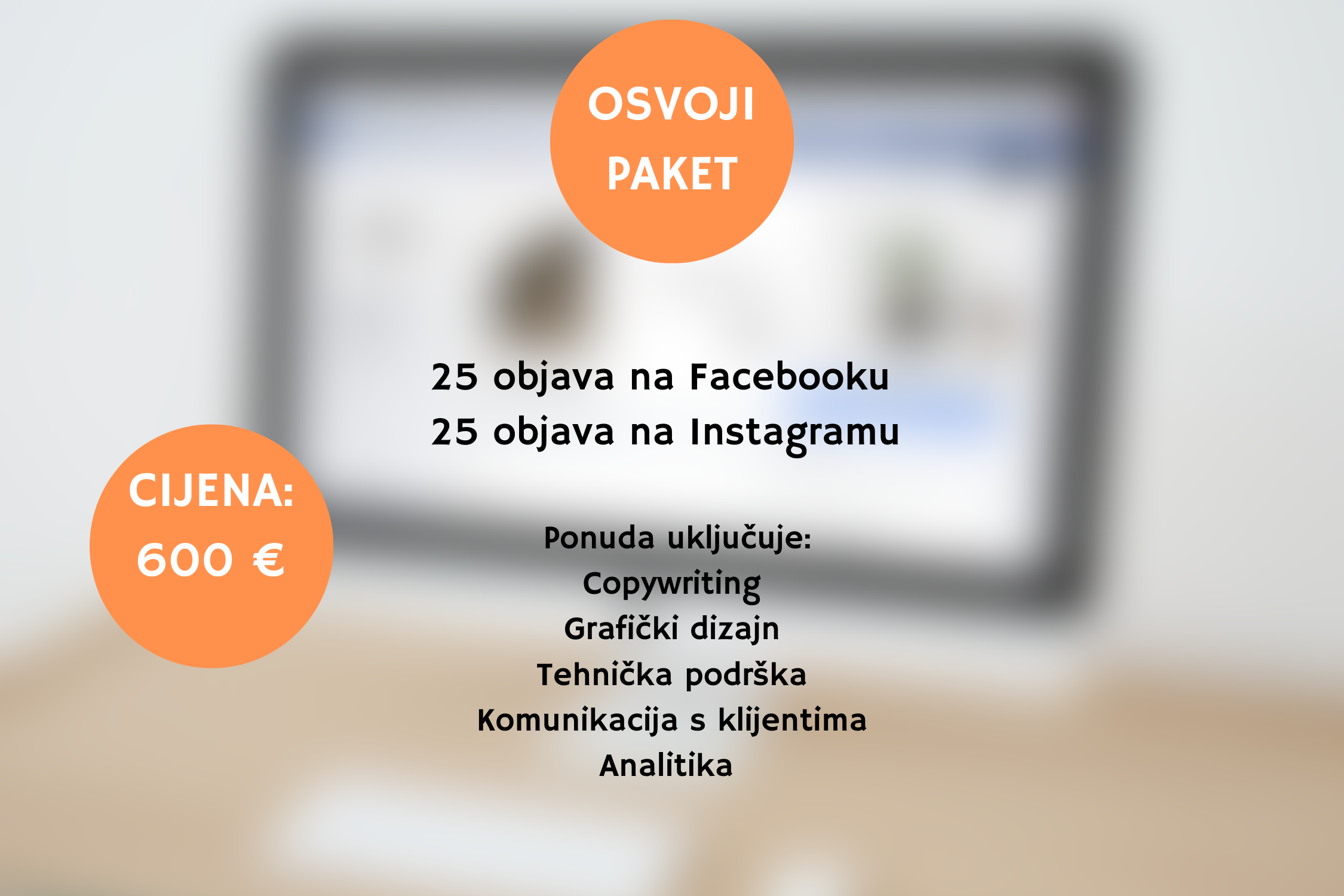 Marketing na društvenim mrežama potreban je kako biste se približili širokoj publici i uvijek bili dostupni svojim klijentima, kupcima, pacijentima… Facebook i Instragram odlična su kombinacija za svaku tvrtku, obrt, ordinaciju ili radionicu kako bi kroz fotografije i kratke, a efektivne tekstove privukli nove klijente. Naša usluga uključuje sve vezano za društvene mreže – od stvaranja vizuala, pisanja tekstova, tehničke podrške i podrške prema vašim korisnicima do analize vaših ciljnih skupina i proširenja dobrog glasa o vašem core biznisu. Promociju oglasa i objava vršimo po dogovoru s klijentom i onda zajedno određujemo budžet. Važno je napomenuti da djelatnosti i oglasi koji sadrže alkohol, duhanske proizvode, eksplicitni sadržaj, ilegalne proizvode (kopije poznati brendova) i medicinske djelatnosti ne promoviramo – zbog vaše i naše zaštite. Facebook ima jasna pravila vezana što se smije, a što se ne smije promovirati zbog zaštite računa i stranica gore navedeni sadržaj ne promoviramo.